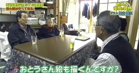 鶴瓶)何物与えとんねん!天は。なんで、そんなに器用ですの?できないものは、ないでしょ? できないこと、いっぱいあるよ。 照子)散歩も! 鶴瓶)散歩は誰でも、できまんがな。 信夫)加山さんが描いてるのは、テレビで拝見させてもらってます。 鶴瓶)なかなか描けないよ。子どものころから好きだった? 信夫)好きだったですね。やる機会は、なかった。 鶴瓶)あれ、いつ描かはったんですか? 信夫)あれは昨年。和紙も、このところで、すいてる和紙です。 鶴瓶)あれ、和紙で描いてるんですか? 信夫)親戚に和紙やっているのが、ありますので。 おとうさんが、すいてるいるわけじゃないの? 信夫)おじさんが。 おじさんが。こう、やってるわけね。あれ、難しいんだよねぇ〜。厚みが均等にいくのに大変なの。 信夫)(和紙)ありますから。 紙だけでも見せてもらいたいねぇ。描いてるんだよ。 鶴瓶)必然ですよ。和紙に描いてる人と出会わないじゃないですか。 あっ、これだよなぁ! 信夫)何回も何回も、すいて。 照子)これ、持っていってください。 僕いやぁ〜、いいね!これは、ものすごくいいわ! 鶴瓶)ちょっと目輝いてきたもん! すごいわ、これ! 信夫)女房のお母さんの、きょうだいが(紙すき職人)。 鶴瓶)おかあさん、こういうの分かるんですか? 照子)見てるのは、見てるねぇ。 鶴瓶)全然関心なさそうですね。これ、何枚くれはるんですか? 信夫)みんな持ってって、いいですよ。 鶴瓶)これ、みんないただいて!? ええ交渉してくれてありがとうね。本当にありがとうございます。 鶴瓶)きょう、来てよかったでしょう? よかった。 |
