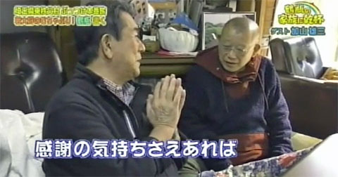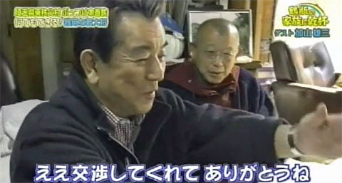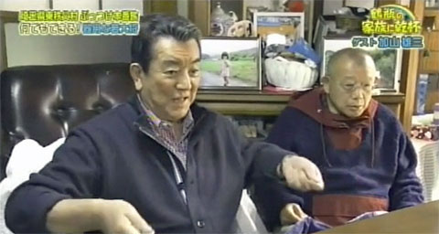 鶴瓶)あの松ね、さっき聞いたんだけど、小学校の時に植えたって。 へぇ〜、小学校で? 鶴瓶)その人も80歳、言うてはりました。 きれいな手入れやね。 鶴瓶)すみません!すいません、ちょっとぉ! すみません! 鶴瓶)おとうさん、どこ行かはった? 照子)鶴瓶さんですか?あらまあ。 鶴瓶)加山さんも、いてはりまっせ。おとうさん、どこ行きました? 照子)今、ごはん食べてますけど。 鶴瓶)おとうさん、加山さん来はりましたで。 信夫)鶴瓶さん? いやぁ、どうも!はじめまして! 照子)先週ね、見ながらこういう番組が来たらどうしようって、言ってた! 鶴瓶)出てきてくださいよ。俺のとき出て、加山さんのとき引っ込む、なんで! 照子)寄ってくれればいいのに。 鶴瓶)寄りましょか? なんか慣れてるな、やっぱり。急に人のうち入って。ええのかなぁ。 |