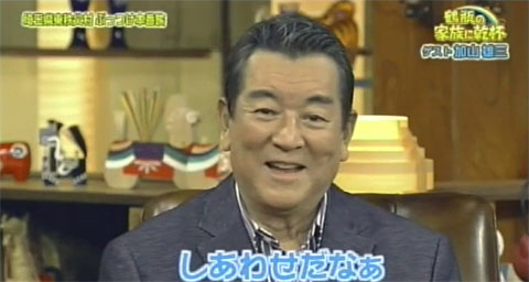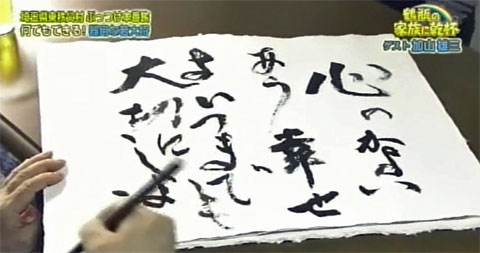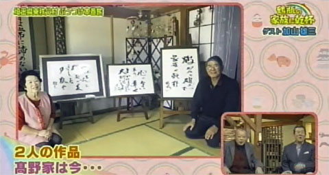 紙っていうのは、いろんな種類があって。見た瞬間に、すげえいい紙だ!って。思った途端に書き 小野)何か、お書きになりましたか?お持ち帰りになって。 いや、まだ。大切に保存してあって。言葉がいっぱいい出てきて、その中から選んで。いい作品を 鶴瓶)個展開いたときに使うと思うわ。 小野)高野さんのところの、お二人の書が。こんな風に額縁に収まって。今や、近所の人と親戚の うれしいねぇ。ありがたい。 小野)ちょっと、加山さんに、お願いがあるんですが。名曲「君といつまでも」の名セリフを。 生で!?しあわせだなぁ。 小野)おほほほほぉ。 おほほだって。 |