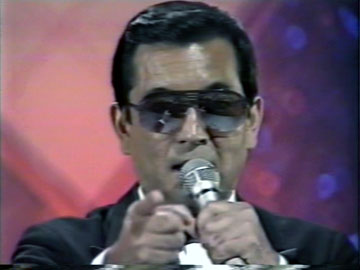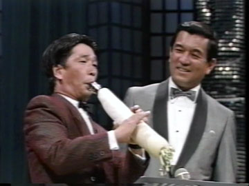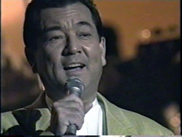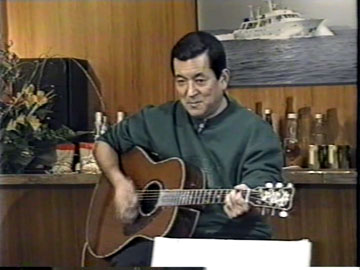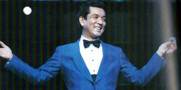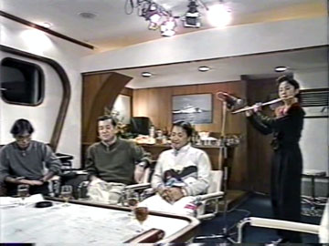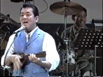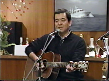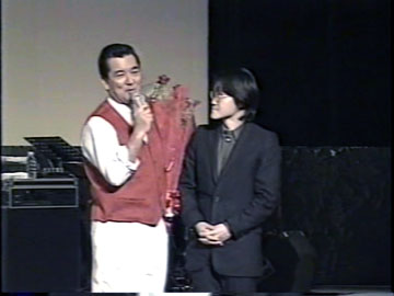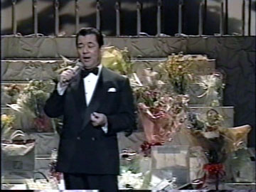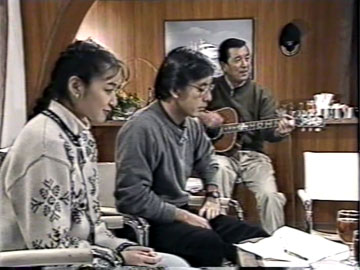 | 園城三花さんのフルートに聞き入る加山さんとゴルフの倉本プロ | ”湯沢旅情”を唄う加山さん | ||||||||