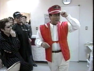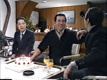左は「電波少年」から贈られた還暦祝いの赤いちゃんちゃんこと帽子を身に着けて、ご機嫌な加山さん。 |