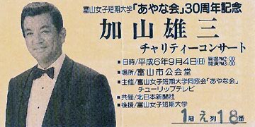 | 9月4日に富山市公会堂(今はもう存在しません)で、富山女子短大の同窓会のイベントとして加山さんのコンサートが行われました。 前から4列目中央で見ました。 チケット(10,000円)は高かったですが・・・。 加山さんの結婚記念日だったので、事前に事務局にTELを入れ、「SEPTEMBER 4th」をリクエストしましたが、残念ながら歌われませんでした。 |